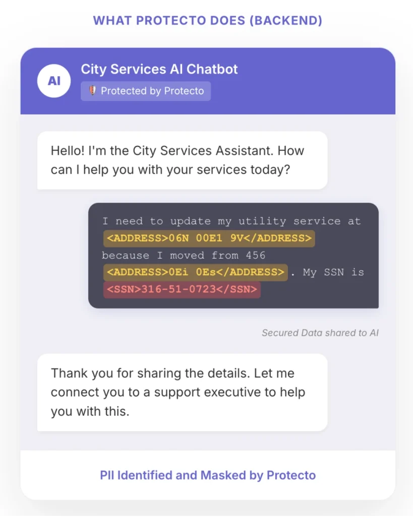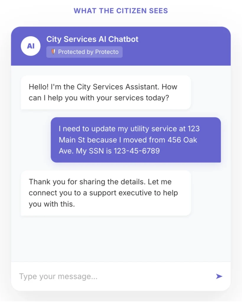 Your residents expect instant answers. Your compliance team expects zero data leaks. Protecto lets you build AI chatbots that actually work in government, without risking PII exposure or breaking data protection rules.