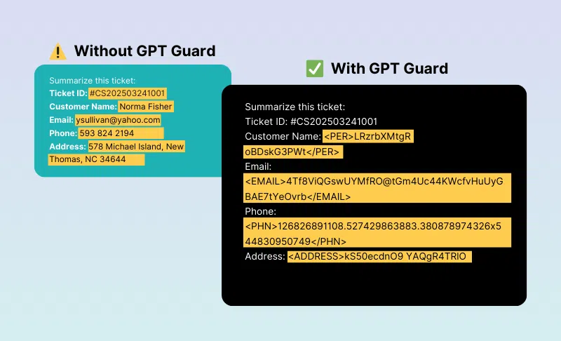GPT Guard ensures sensitive data is masked and not blocked from AI. This unique context preserving masking technique ensures privacy, accuracy, and ease of use—so you can confidently enable AI in your organization.