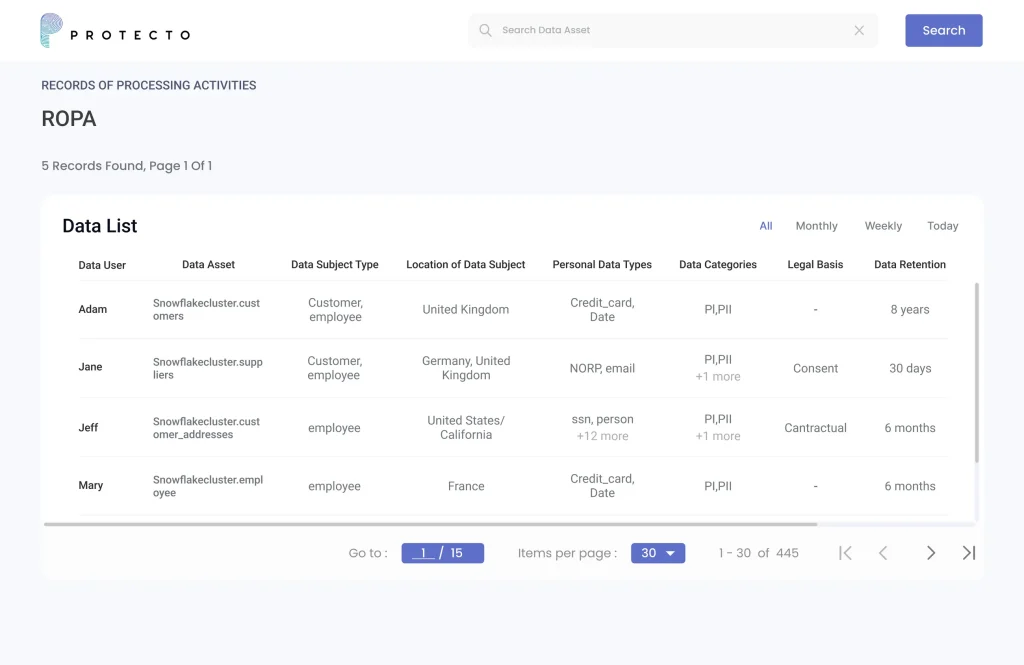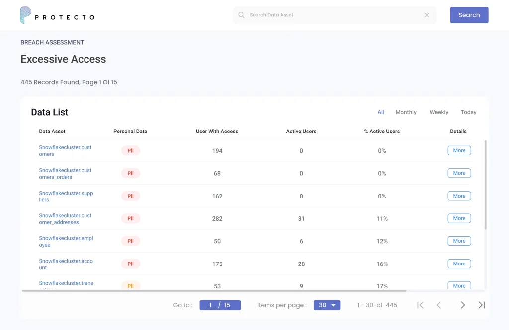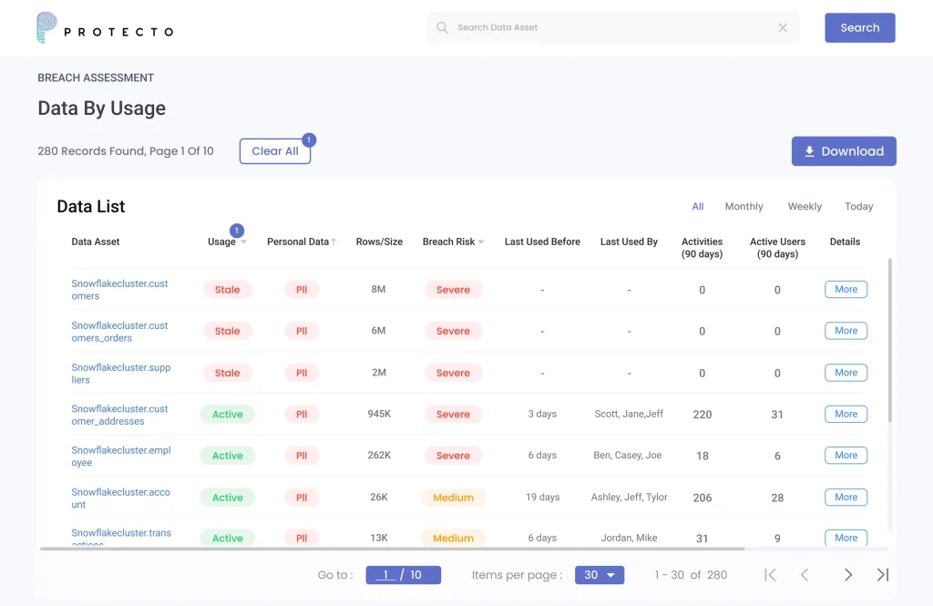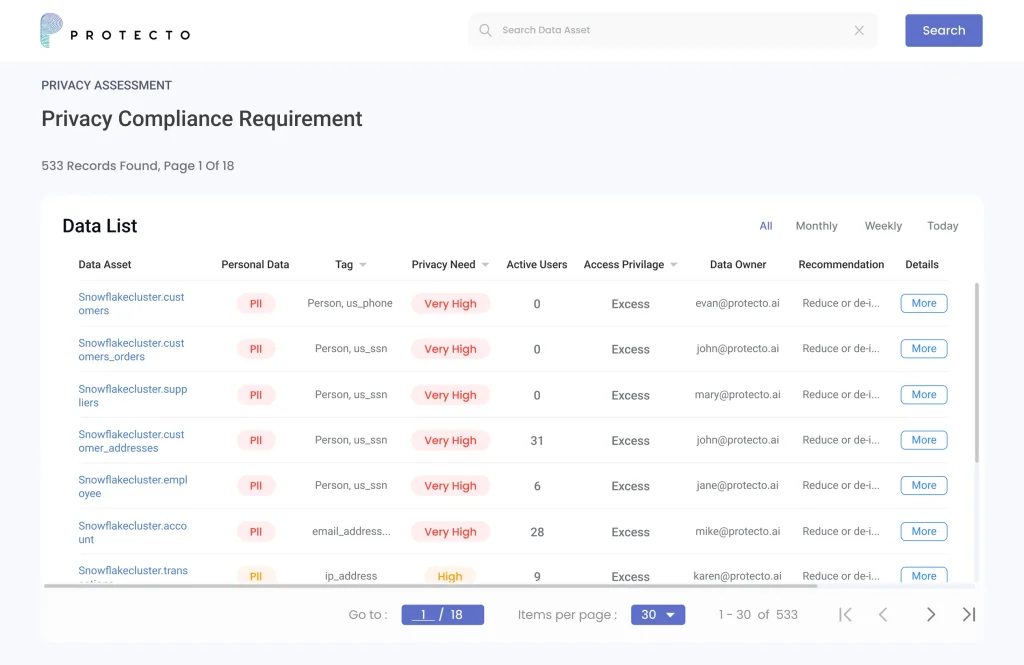 Finding data privacy risks in an enterprise is a complex, and time-consuming effort. Protecto Data Privacy Intelligence identifies risks associated with enterprise data by factoring usage, access, sensitivity, and risks associated with enterprise data - in just a few hours.β